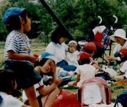 保育所を9時に出発。大勢のお母さん方に見送られ、子ども達ははりきってバイバイをしていました。望もずっとバイバイと手を振り続けていました。行き先は鶴見緑地公園です。我家から公園入り口までは徒歩5分ですが、保育所からは大人の足で15分位かかり、公園の中を横切るだけで20分はかかります。4、5才児はずっと歩いて行きましたが、3才児は市バスに少し乗りました。お弁当の頃に私は自転車でこっそり写真を撮りに出掛けました。鶴見緑地は大きな公園で、あちこちの保育所や小学校が遠足に来ていましたが、望のバギーが目印になってすぐに見つけることができました。お友達の中で保母さんに抱っこされて望は弁当を食べていました。カメラをのぞいて良く見ると、望の顔は子ども達の中に赤ちゃんが一人いるといった感じでした。望遠レンズとはいえ、もっと良く撮ろうと近づいているうちに保母さんや子ども達の何人かに見つかってしまいました。私は「しーっ、ないしょ、ないしょ。」と人差し指を口に当てて合図しました。望のお弁当タイムはなかなか終わりそうになかったので、数枚写真を撮って帰宅しました。