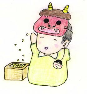 2月3日は、節分。午後、保育所に、鬼がやってきたようです。保育所では、行事の度に保母さん達がかぶりものをしたり変装して子ども達を楽しませてくれます。でも、今回は楽しむどころではありません。みんな恐くて大騒ぎ。もちろん望も大泣きだったそうです。大きくってこわーい鬼がやって来たそうです。来年は、お母さんもしませんかと鬼役の保母さんに誘われてしまいました。ピッタリの役かもしれません。望は、鬼は恐いし、その上、友だちが泣いているのが相乗効果になって、真っ赤な顔をして泣き、そして、保母さんの胸に顔を埋めて泣いたようです。夕方、保育所に迎えに行くと、望のクラスの子ども達が、「鬼が来た。」と口々に教えてくれました。「望ちゃん、泣いたで。」と教えてくれる子どもの目は、皆赤くて「私も泣いたけど。」と語っていました。泣いていない子は、「僕、泣かんかった。」と自慢そうでした。