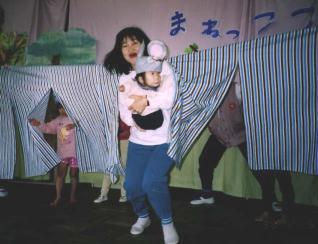 私は、運動会の時には、望はどんな表情をしているのだろうか、望はちゃんと参加できるだろうか等と、望の様子が気になっていたのですが、今回は、他の子どもの様子も見る余裕ができて、まねっこごっこシアターを楽しみました。腕白だけど人前でお遊戯するのが苦手だった子が、元気に歌ったり踊っていたり、いつもはおとなしくて目立たない子が上手に踊ったり演奏していたりしていて、うれしい発見がたくさんありました。4才児や5才児になるとだんだんと保母さんが入る場面も少なくなって、うまくできない子を他の子が助ける様子も見られて、子ども自身の力でやり遂げることができるように成長しているようでした。本当に、1人1人が主役の「まねっこごっこシアター」でした。そして望も、銭太鼓の時以外は、どの場面でも生き生きとして、とっても楽しそうな表情をしていました。私は、その表情を見て何度も涙がこぼれそうになりました。(「おはよう」とねずみのお母さん)
