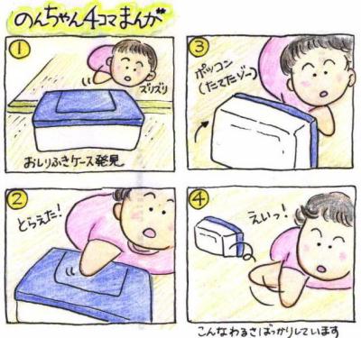 夕方、迎えに行くと、保育所の門の所で早くお迎えに来た同じクラスのYちゃんのお母さんとすれ違いました。Yちゃんのお母さんは、小学校の先生です。「久しぶり」と挨拶するとYちゃんのお母さんは、ちょっと不安そうな顔で「担任は、O先生とI先生の2人だったよ。」と教えてくれました。O先生は、昨年度、望にずっとついていて下さった保母さんです。I先生は、昨年度は年長クラスの担任でした。望は、全面介助が必要な子だから、担任は、普通より1人多い3人だと思い込んでいた私は、少し驚きました。Yちゃんのお母さんもそれでちょっと複雑な顔をしていたのでしょう。「それで、きく組(年長)さんが(担任)3人になってた。」とYちゃんのお母さんは続けました。そこで私は納得しました。6日の入所式で、きく組に全面介助の必要なTくんが入所してくるのです。保育所の門からゆり組の部屋に行くまでの間に、私の「担任が2人の不安」は、「担任が2人への期待」に変わりました。「保母さんは、ちょっと大変だけれど、望にとってはいいかもしれない。」とわずかの間に思ったその図太さは、望と共に私も成長した証拠かもしれません。