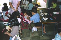 療育センター通園中に望の進路を考えていた時、保育園と幼稚園の違いはどこだろうと思ったことがありました。厚生省と文部省の違いとか、児童福祉法と学校教育法との違いとかということではなく、その内容がどう違うのかと思ったのです。発達を助長するという、いわゆるお勉強的要素の違いとか、保育時間の長さの違いとか、自分なりにいろいろと考えてみました。(この頃は、早期教育的なことを行っている保育園もありますし、希望者に長時間の保育を行っている幼稚園もあり、保育園と幼稚園との差が小さくなってきたところもあります。)「慣れる」のに時間のかかる望には、保育時間の長い保育園がいいし、乳児もいる保育園では保母さんがオムツ交換や食事に問題無く対応してくださるだろうと、私達は保育園を選びました。でも、通所2年目になって、改めて保育所(公立は保育所といいます)にしてよかったと思うことがありました。それは、保育所が生活の場であることです。生活習慣を身につけることだけではなく、子ども達が保母さんと一緒に日々の生活を作っていっていることです。そのひとつに、当番活動があります。